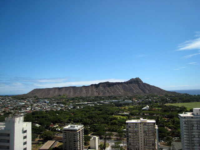 撮影場所; ハワイ マリオットビーチリゾート&スパ 29階 マリオットビーチリゾートからの眺めです。 ホノルルの中でも、ダイヤモンドヘッド側のホテルのため、障害物が無い状態でダイヤモンドヘッドの眺めが楽しめました。