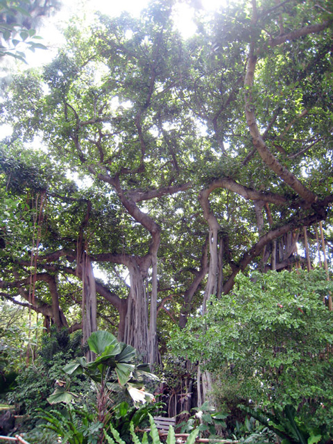 撮影場所; ハワイ ホノルル動物園にて撮影 バニヤン・ツリー(Banyan Tree)といい、和名で「菩提樹」ともいいます。 枝からツルを下に垂らし、そのツルが地面に着くと太くなり、枝自体を支えるそうです。 とても変わった木ですし、菩提樹という名前のように、神聖さを感じます。