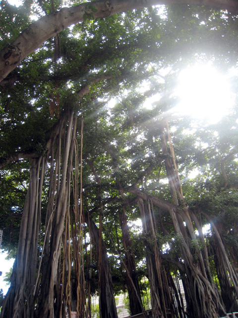 撮影場所; ハワイ カメハメハ大王像の近くにて撮影 バニヤン・ツリー(Banyan Tree)といい、和名で「菩提樹」ともいいます。 枝からツルを下に垂らし、そのツルが地面に着くと太くなり、枝自体を支えるそうです。 とても変わった木ですし、菩提樹という名前のように、神聖さを感じます。 日の光を入れて写真を撮ったので、余計に神秘的な写真になりました。 けっこう気に入っている写真です。