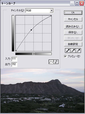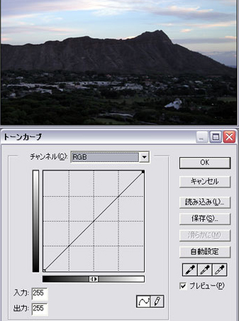 写真を明るく、くっきりさせたい時や、人物の表情を 明るくしたい時などに、 「トーンカーブ」を試してみて下さい。 <補正前> ここでは、山の写真に使用してみます。 この写真は全体的に暗く、 山肌が目立たない写真になっています。 画像ソフトで「トーンカーブ」を選ぶと、 左のような画面が出ます。 この画面の”斜めの線”をマウスで ドラッグすることで明るさを調節できます。 「PhotoShop」の場合、上のメニューから 「イメージ」→「色調補正」→「トーンカーブ」 を選ぶ。